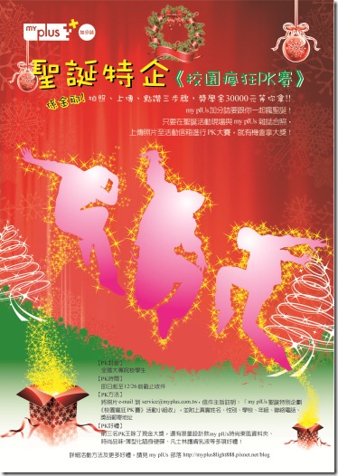 本活動係以校為單位,為全國大專院校共同PK,各學校學生會或聖誕活動舉辦單位,只要於活動現場與myplUs雜誌合照,上傳照片至活動網路進行PK大賽,即有機會獲得精美禮品,歡迎有興趣的同學自行拍照上傳唷!